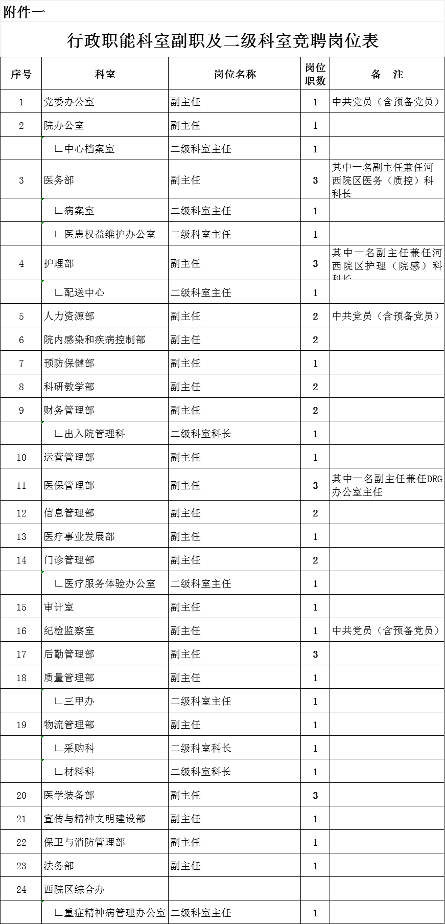 公开竞聘范围:除按照群团组织规定须进行换届选举的(工会和团委)岗位外现有职能部门副职及二级科室负责人岗位均需重新公开竞聘。具体竞聘岗位见附件1和附件2。