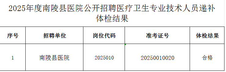根据《2025年度南陵县医院公开招聘医疗卫生专业技术人员公告》,经2025年10月20日递补体检,现将体检结果公布如下,详见附件。