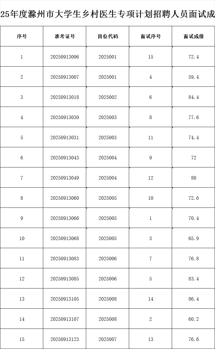 根据《2025年度滁州市大学生乡村医生专项计划招聘人员面试方案》规定,现将面试成绩进行公告。