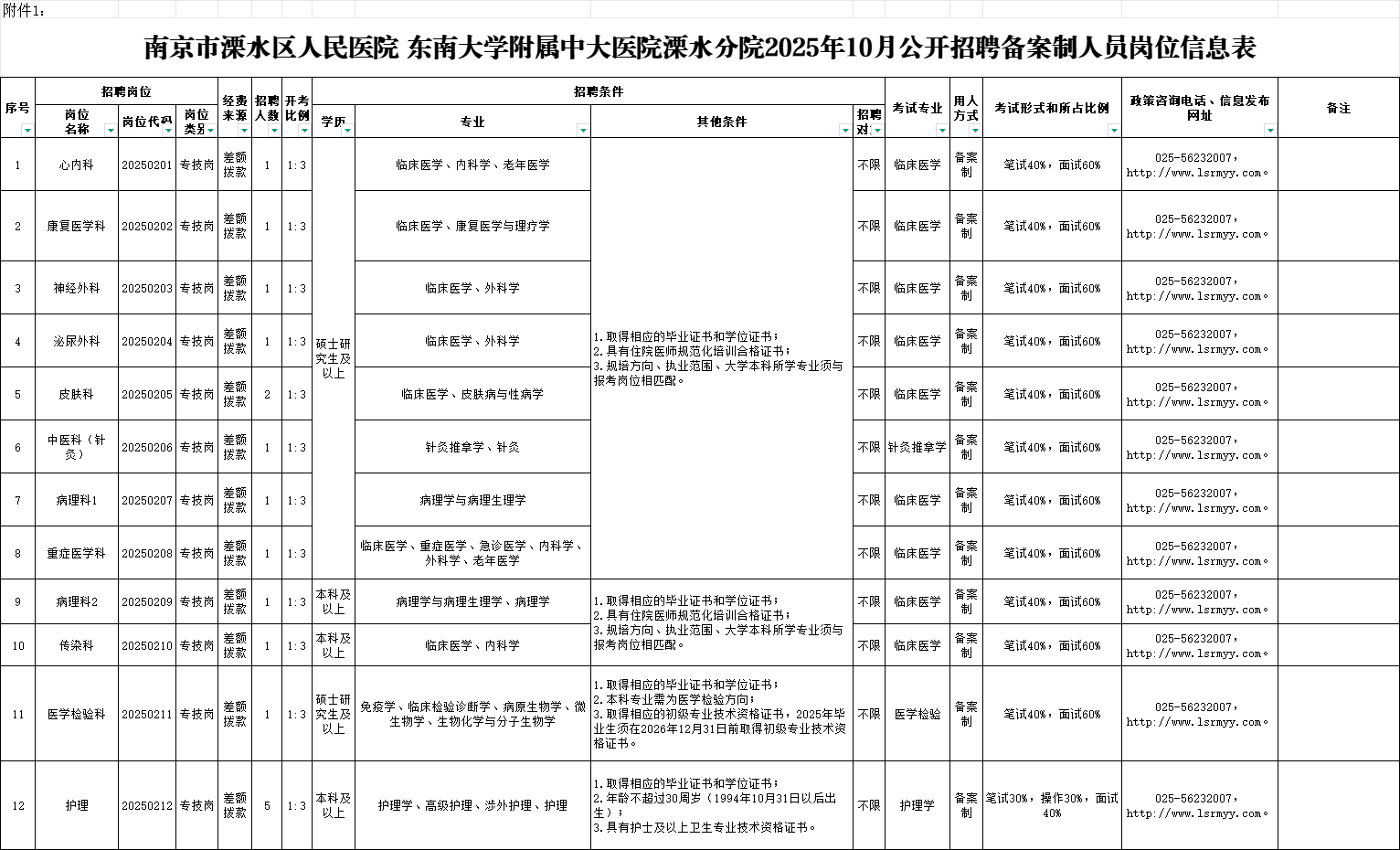 附件1:南京市溧水区人民医院 东南大学附属中大医院溧水分院2025年10月公开招聘备案制人员岗位信息表