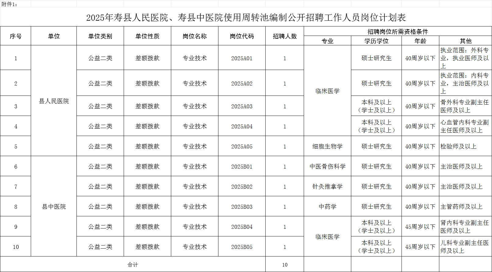 附件1:《2025年寿县人民医院、寿县中医院使用周转池编制公开招聘工作人员岗位计划表》