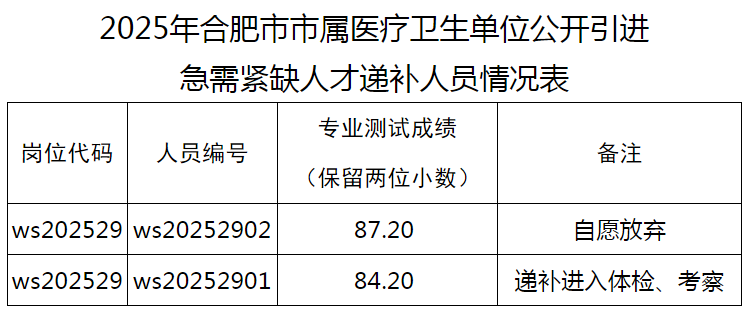 根据《2025年合肥市市属医疗卫生单位公开引进急需紧缺人才公告》,现将2025年合肥市市属医疗卫生单位公开引进急需紧缺人才递补情况公告如下(见附件)。