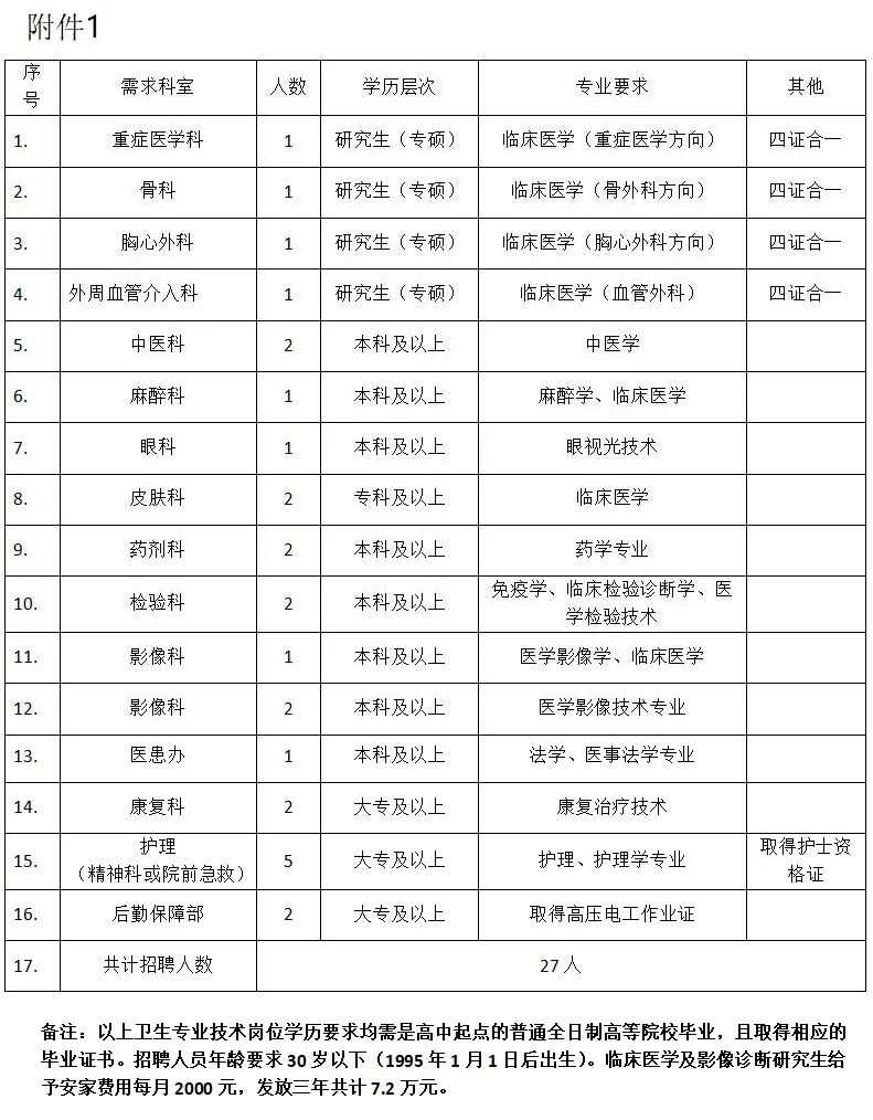 本次面向社会公开招聘27名医疗卫生工作人员,具体招聘岗位、人数及要求详见(附件1)