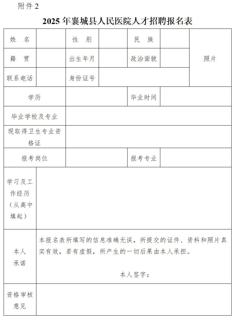 报名时间为2025年10月20日9:00至10月24日17:00(报名时间截止后不再接受任何方式报考)。报考者登录襄城县人民医院邮箱xcxrmyyzp@163.com 提交报名材料。邮件以“姓名(简历)-学历-专业-意向岗位”为主题(姓名后加“简历”二字,如:张三(简历)-本科...),将报名表(附件2)、个人简历等报名所需材料扫描件发送至邮箱。