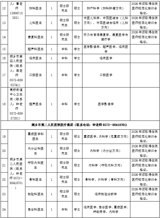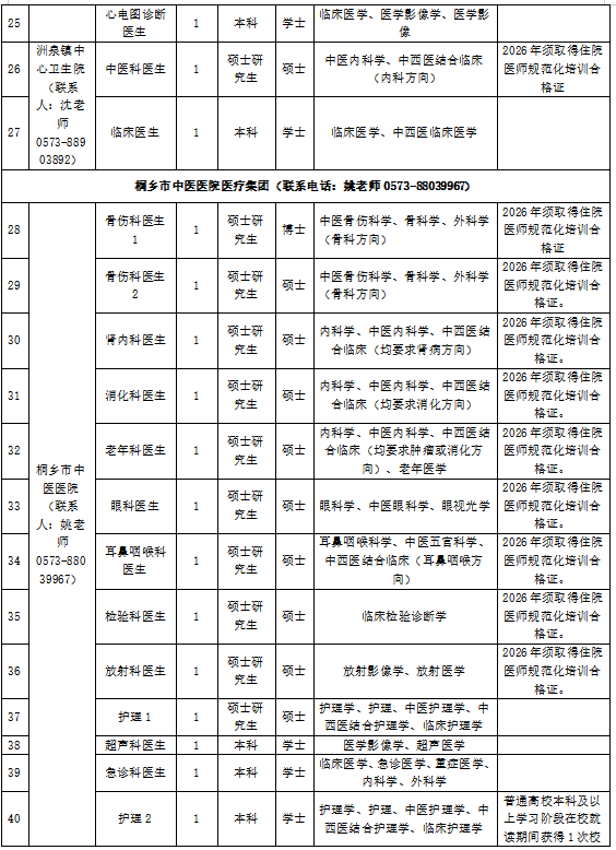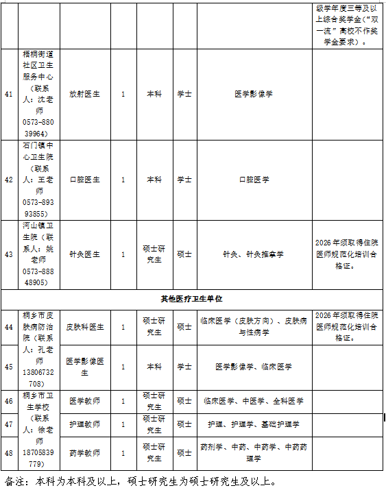根据《桐乡市事业单位公开招聘人员暂行办法》(桐乡市人民政府令第64号)、市卫生健康局和市人力社保局关于《公开招聘2026年卫技人员实施办法》(桐卫发[2025]98号)等文件精神,桐乡市卫生健康系统面向普通高校招聘2026年医学类应届毕业生50名,现将有关事项公告如下: