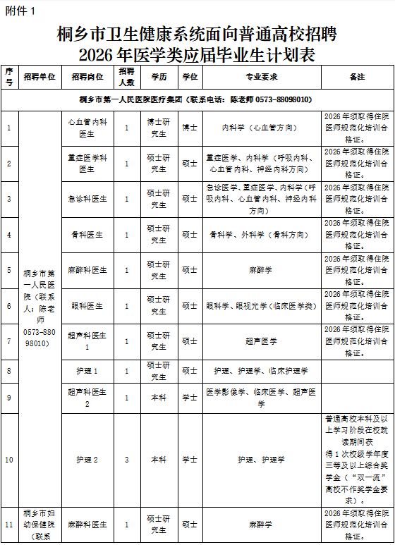 具体的招聘单位、招聘岗位、人数和资格条件详见《桐乡市卫生健康系统面向普通高校招聘2026年医学类应届毕业生计划表》(附件1)(以下简称招聘计划表)。