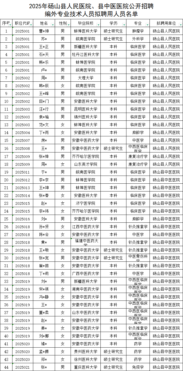根据《2025年砀山县人民医院、县中医医院公开招聘编外专业技术人员公告》规定,现将经笔试、面试、体检、考察合格拟聘用人员名单予以公示(名单见附件)。