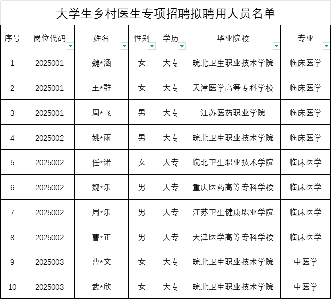 根据《2025年砀山县大学生乡村医生专项计划招聘公告》等相关规定,现将经笔试、专业测试、体检、考察等环节符合聘用条件拟聘用人员名单予以公示(名单见附件)。