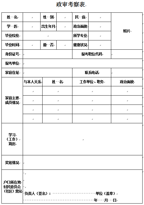 1.政审考察表(见附件3),考生自行下载并按要求如实填写。提供的考察材料依据本人情况按在职人员、非在职人员分别填写。在职人员由原单位提供政治表现方面评价,非在职人员由所在社区或村委会提供政治表现方面评价。考察表中“户口所在地派出所意见”一栏可由考生户口所在地派出所填写或由派出所另外出具无犯罪记录证明,也可从皖事通上开具无犯罪记录证明,查询时间为出生到现在。