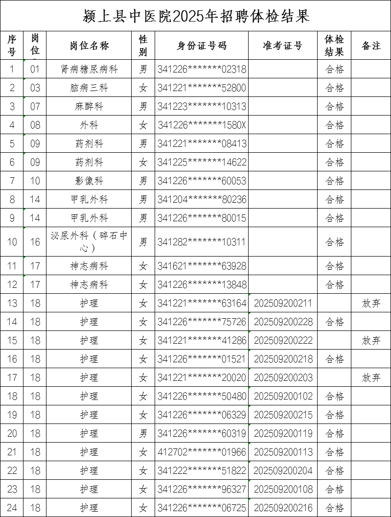 按照《颍上县中医院2025年招聘》公告要求,笔试、资格复审、面试、体检等环节已经结束,现将体检结果进行公示。同时根据招聘计划数和应聘人员数,从高分到低分,按1:1比例确定政审考察对象。体检、考察合格人选出现缺额的,按照规定程序和时限,在同岗位报考人员中,按考试最终成绩从高分到低分依次等额递补,递补各不超过两次。现就体检结果和考察相关事宜公告如下: