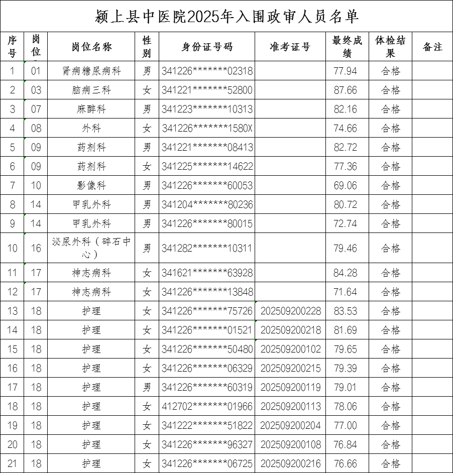 (附件2) 颍上县中医院2025年招聘入围政审考察人员名单.xlsx