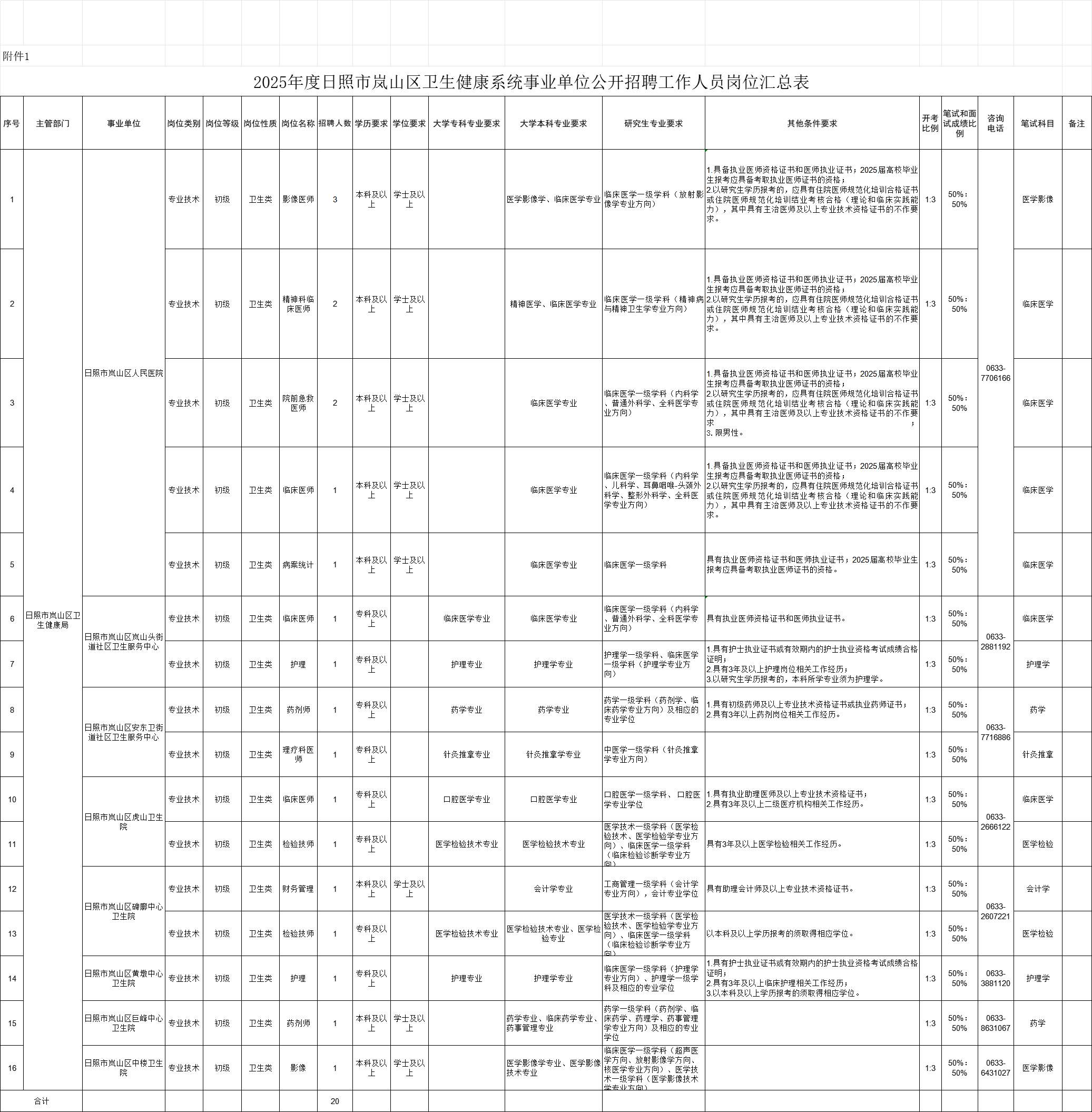 2025年度日照市岚山区卫生健康系统事业单位公开招聘工作人员的岗位条件、招聘人数等具体要求见《2025年日照市岚山区卫生健康系统事业单位公开招聘工作人员岗位汇总表》(附件1)。