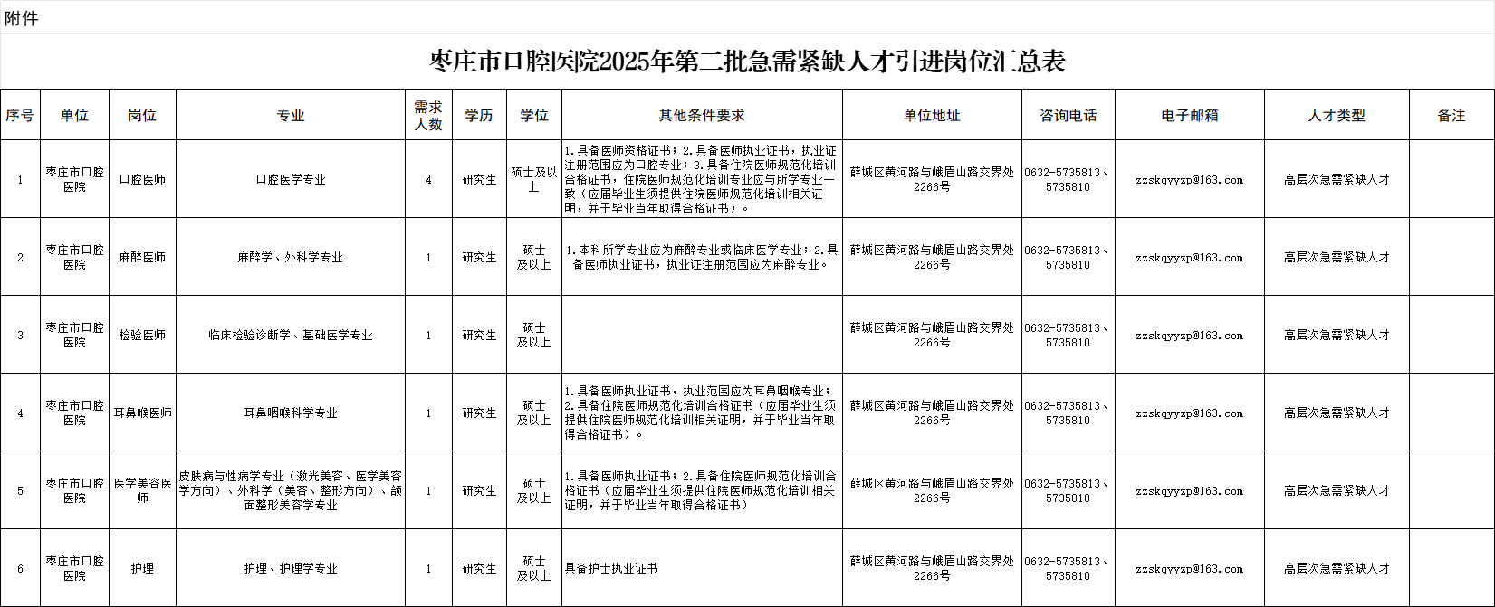 招聘岗位、专业及具体要求详见《2025年枣庄市口腔医院第二批急需紧缺人才引进岗位汇总表》(附件1)