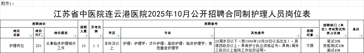 详见《江苏省中医院连云港医院2025年10月公开招聘合同制护理人员岗位表》(附件1,以下简称《岗位表》)。《岗位表》可在连云港市中医院官网(http://www.lygzyy.com.cn)、连云港市中医院公众号查询、下载。(二)遵守中华人民共和国宪法和法律,拥护中国共产党领导和社会主义制度。(四)具备岗位所需的专业和技能条件,能胜任应聘岗位工作。(六)年龄在18周岁以上,28周岁以下(即1996年10月28日至2007年11月5日之间出生)。(七)具备《岗位表》中岗位要求的招聘条件。其中,“专业”条件参照《江苏省2025年度考试录用公务员专业参考目录》(附件2)设置。(八)资格条件中的学历应是国家承认的学历,须取得相应学位。具有国(境)外学历学位的应聘人员须提供教育部留学服务中心出具的国(境)外学历学位认证材料。(九)资格条件中有大学英语四级或六级要求的,需提供相应的合格证书,只有四级或六级考试成绩通知单的,相应的成绩原则上不低于425分。在官方语言为英语的国家取得学历学位的留学回国人员,应聘有英语四级、六级要求的岗位时,可以不提供英语四级、六级的合格证书或成绩通知单。(十)资格条件中工作经历计算的截止时间为2025年12月31日,须提供相关证明材料。(十二)取得祖国大陆普通高校学历的台湾学生和取得祖国大陆承认学历的其他台湾居民应聘时按国家和江苏省的有关规定执行。报名采取现场报名方式进行。报名时应聘人员要明确申报岗位,每人限报一个岗位。1.时间:2025年10月28日至 2025年11月5日(节假日正常休息,周一至周五上午8:30-11:30、下午2:30-5:00)。2.地点:连云港市中医院组织人事处521室(连云港市海州区南极南路127-2号 连云港市少儿活动中心五楼)3.联系人:夏老师、章老师。联系电话:0518-85574006。应聘人员须携带岗位所需有关证明材料的原件和复印件到现场报名。也可由他人代为报名(须持代报者身份证原件和复印件)。需提供以下报名材料:1.《江苏省中医院连云港医院2025年10月公开招聘合同制护理人员报名表》(附件3,贴正面免冠照片)。4.学历学位证书(均需提供学信网证明,即教育部学历证书电子注册备案表及中国高等教育学位在线验证报告);国(境)外留学人员须提供经教育部留学服务中心认证的国(境)外学历学位认证材料。6.通过资格审查的应聘人员须缴纳报名费50元。享受国家最低生活保障家庭的应聘人员,可凭相关单位出具的证明减免报名费。7.通过资格审查并且完成缴费确认的人员,即报名成功。缴费成功后不退还报名费,但应聘岗位被取消或符合条件的最低生活保障家庭人员除外。岗位开考比例为1:3,如未达到开考比例的岗位,经院党委研究决定是否开考。1.资格审查合格后,方可参加招聘考试。招聘单位将以电话或短信的方式通知应聘人员准考证领取时间、考试时间、地点及相关安排,在此期间,应聘人员务必要保持报名时预留的通讯工具畅通,若出现由于应聘人员本人原因导致错过考试等情况,由应聘人员本人承担全部责任。2.应聘人员须按岗位要求,真实准确完整地填写有关信息。3.凡弄虚作假的,一经查实,即取消应聘资格,除本公告另有说明,或者国家、省另有规定外,信息真实性以报名时的实际情况为准。特别提醒:应聘人员务必诚信应聘,参加报名即视为认可本次招聘公告确定的报名办法和招聘程序等规定,填写的个人信息应真实、准确、有效。应聘人员应确认本人完全符合相关岗位的资格条件,如对资格条件和岗位要求存在疑问,应及时向招聘单位进一步咨询确认。资格审查工作贯穿于招聘工作全过程,在招聘各个环节,如发现应聘人员报名时填报信息不实、不符合资格条件、弄虚作假骗取应聘资格的,将及时终止或取消考试(聘用)资格。对存在恶意填报报名信息、扰乱报名秩序或者伪造学历证明及其他有关材料骗取考试资格等严重违纪违规行为的,将按照有关规定处理。考试采用“笔试+技能测试+面试”相结合的方式进行,每个环节满分均为100分。分别按照笔试30%、技能测试30%、面试40%的权重计入总分。(1)笔试内容以招聘岗位所需的相关专业知识为主,不指定辅导用书。(2)笔试采取闭卷答题形式进行,满分为100分,合格分数线为60分。笔试阅卷结束后,在笔试合格人员中根据笔试成绩从高分到低分的顺序,按各招聘岗位拟聘用人数,在3:1范围内确定技能测试、面试人选(末位成绩并列的,一并参加)。考试结束后,按照总成绩从高分到低分的顺序,根据招聘岗位拟招聘人数,按1:1的比例确定体检人选。入围体检人员须在拟入围体检名单公示之日起7日内到我院完成体检入围人员,逾期视为个人自动放弃体检资格。对体检合格且公示无异议的人员,确定拟聘用人员名单。拟聘用人员须在名单公示结束后30日内到我院报到上班,逾期将视为个人自动放弃聘用资格,我院也不再为其保留聘用资格。在拟聘用人员名单公示之日起30日内,拟聘用人员必须与原工作单位终止劳动合同,并提供相应的解除劳动关系证明。若因未能依法解除与原单位的劳动关系而引发的法律责任及后果,应聘者将自行负责。七、本公告未尽事宜由江苏省中医院连云港医院负责解释。