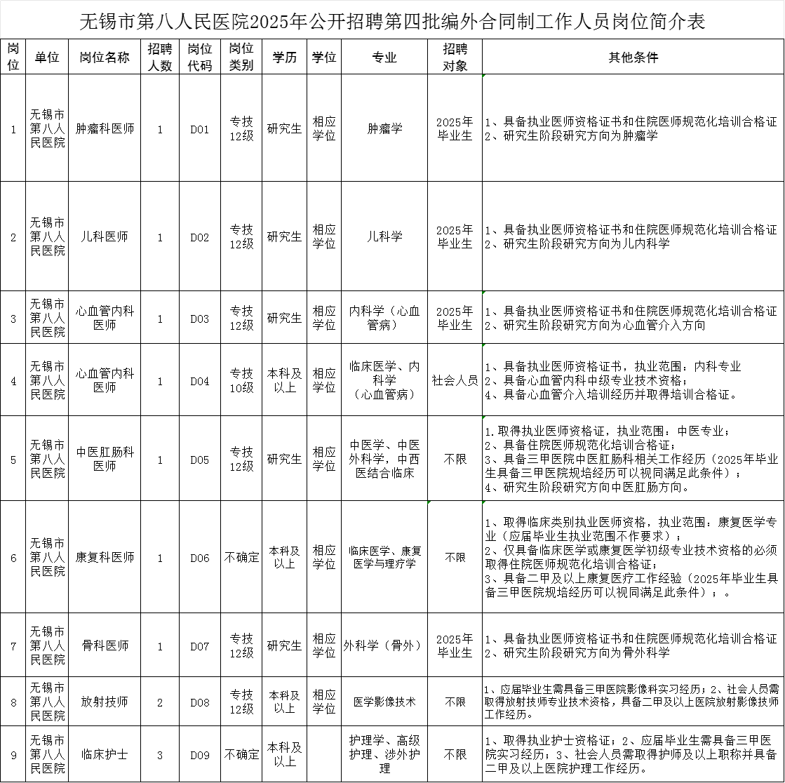 招聘岗位及条件等见《2025年无锡市第八人民医院公开招聘编外合同制工作人员岗位简介表》(附件1)。