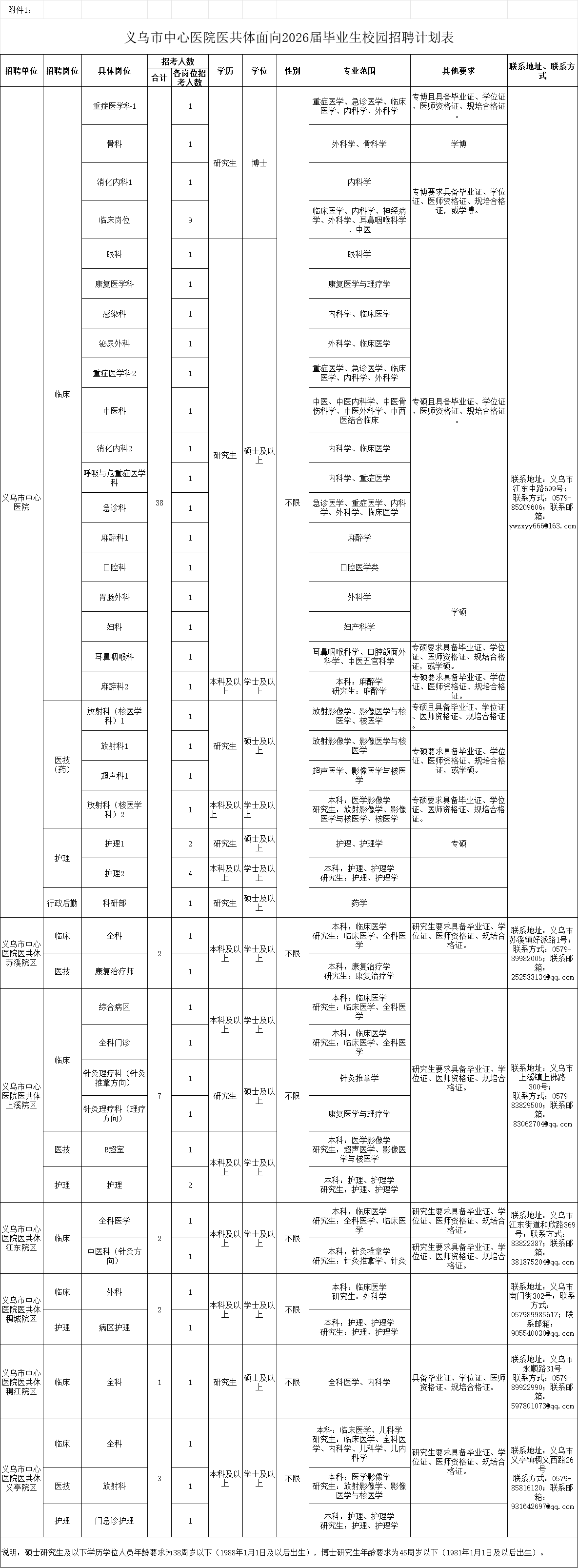 6.其他条件和要求详见《义乌市中心医院医共体面向2026届毕业生校园招聘计划表》(附件1)。
