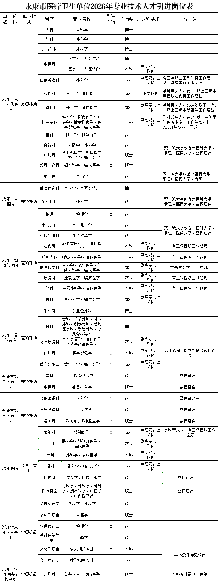 附件:1.永康市医疗卫生单位2026年专业技术人才引进岗位表