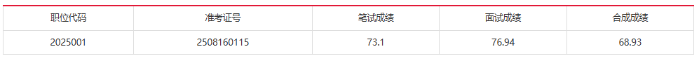 一、体检对象: 职位代码 准考证号 笔试成绩 面试成绩 合成成绩 2025001 2508160115 73.1 76.94 68.93