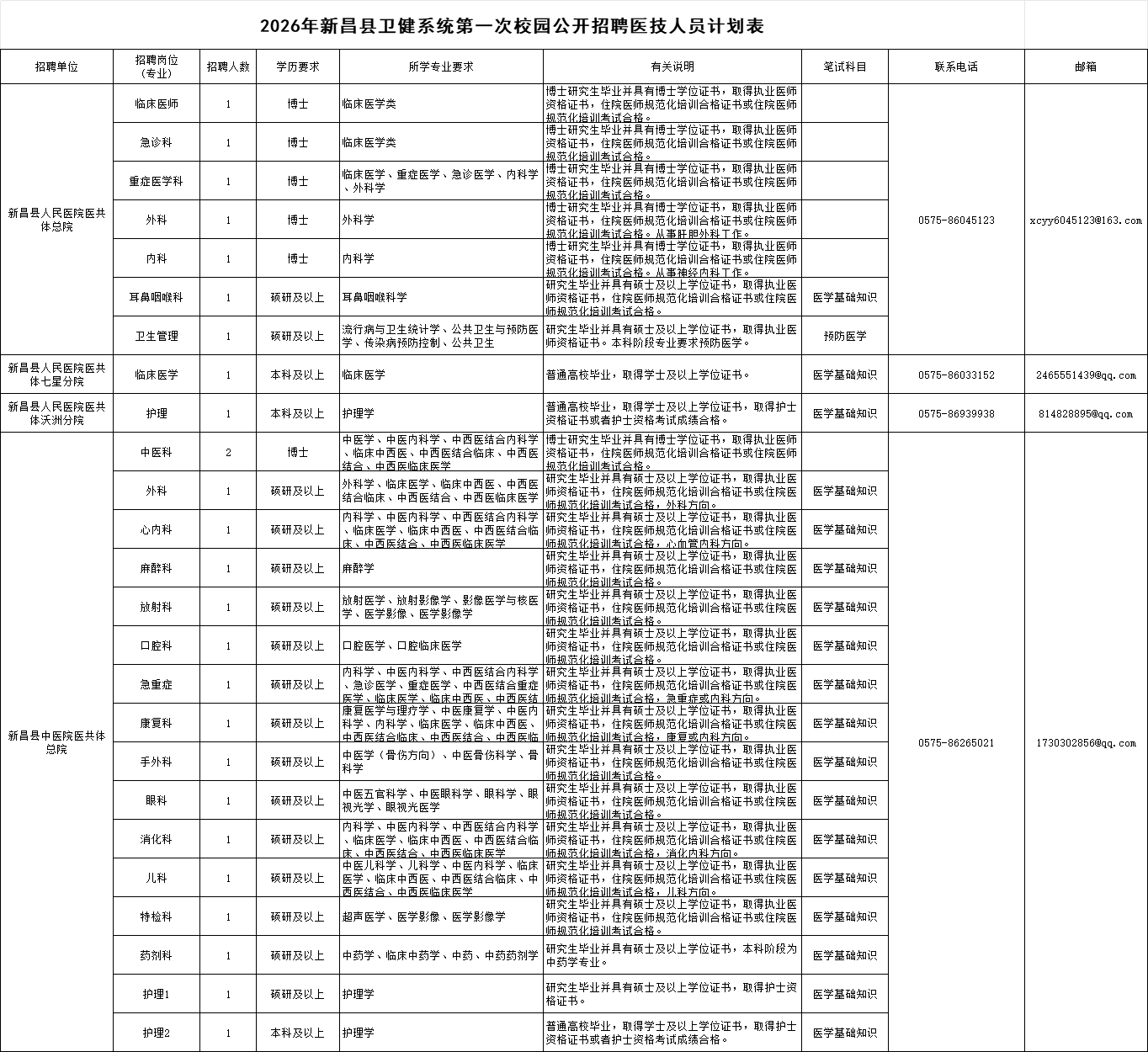具体招聘单位、岗位、人数和报考资格条件,详见《2026年新昌县卫健系统第一次校园公开招聘医技人员计划表》(附件1)。
