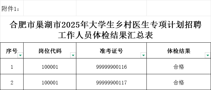 合肥市巢湖市2025年大学生乡村医生专项计划招聘工作人员考生体检结果汇总表(详见附件1)。
