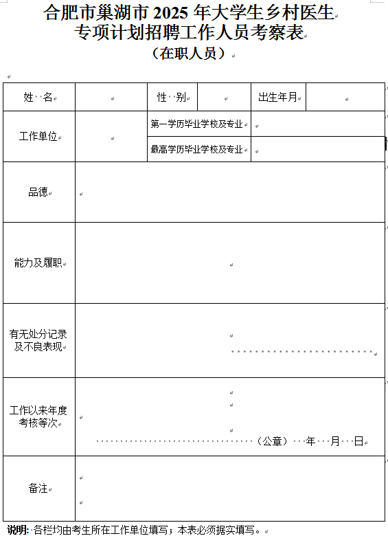 附件2:合肥市巢湖市2025年大学生乡村医生专项计划招聘工作人员考察表.doc