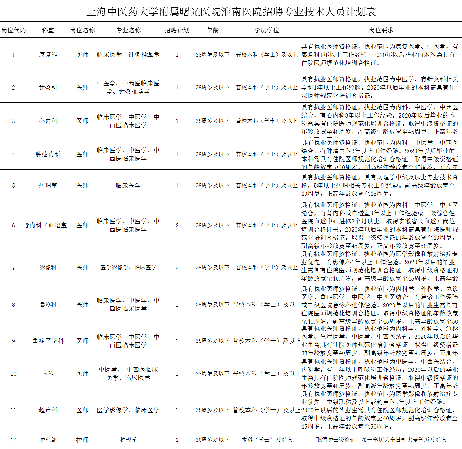 招聘对象除满足《上海中医药大学附属曙光医院淮南医院招聘计划表》(附件1)上的岗位条件外,同时必须符合以下条件: