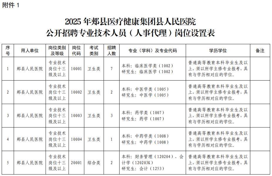 附件:1.2025年郏县医疗健康集团县人民医院公开招聘专业技术人员(人事代理)岗位设置表