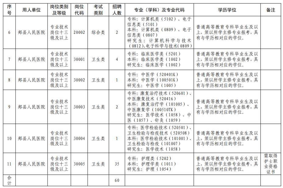 根据郏县人民医院需求情况,本次计划公开招聘专业技术人员(人事代理)60名。