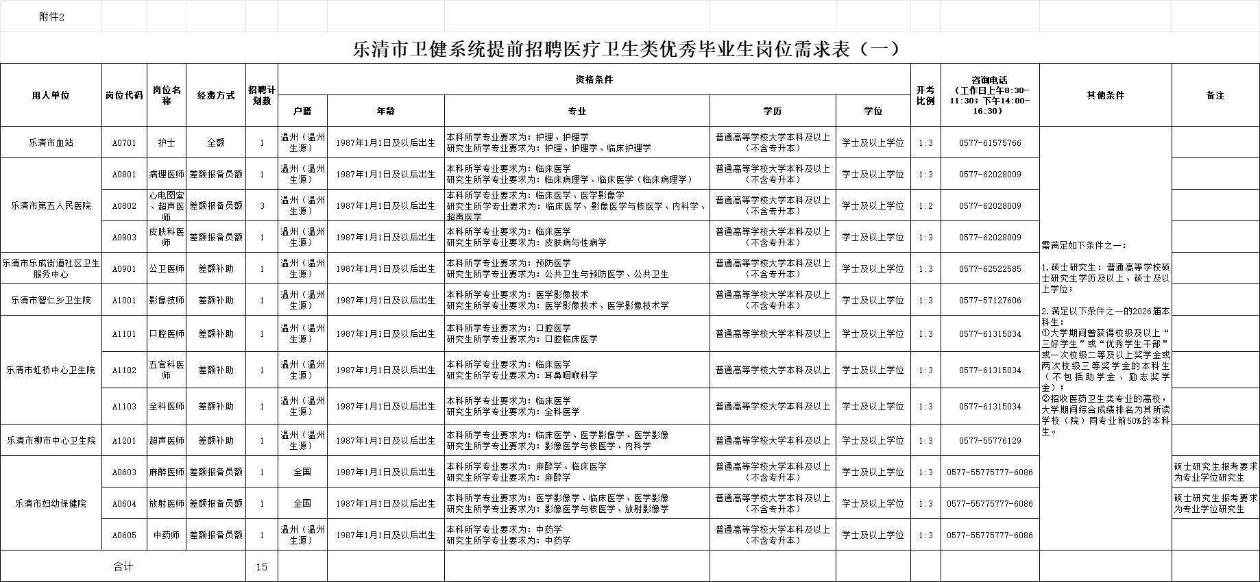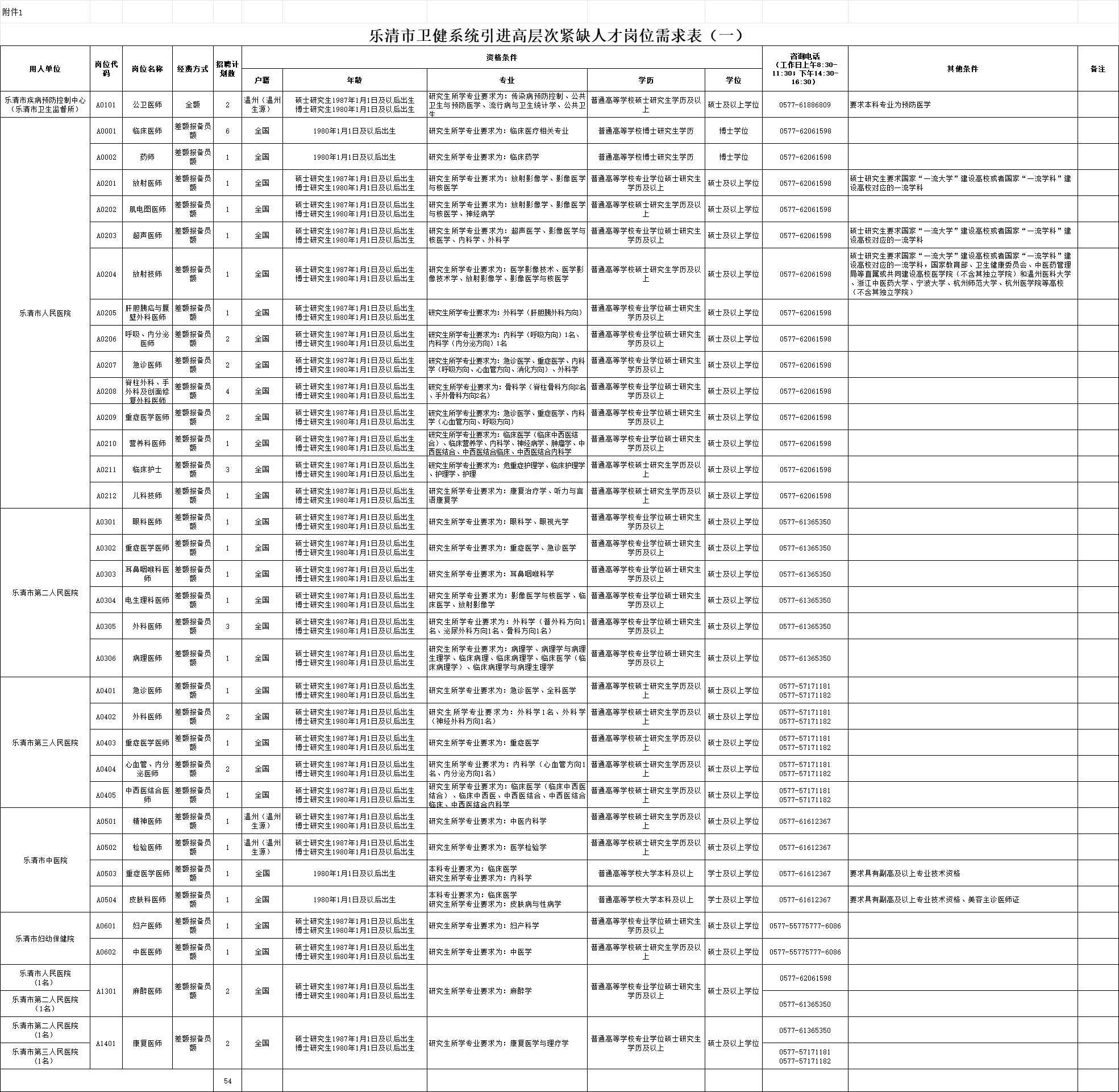 (一)招聘岗位需求详见《乐清市卫健系统引进高层次紧缺医疗人才岗位需求表(一)》和《乐清市卫健系统提前招聘医疗卫生类优秀毕业生岗位需求表(一)》(附件1、2)。