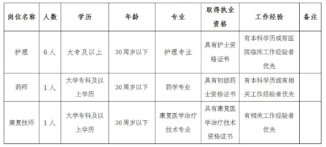 岗位职责: 护理: 为患者提供全面护理照护,确保患者安全,与医疗团队协作,维护诊疗环境。 药师: 负责医院药品管理、调配,为医生和患者提供用药指导,保障药品安全与质量。 康复技师: 为患者实施康复治疗,评估病情并制定计划,维护康复设备,记录治疗数据,指导患者及家属康复训练,配合医疗团队协作。
