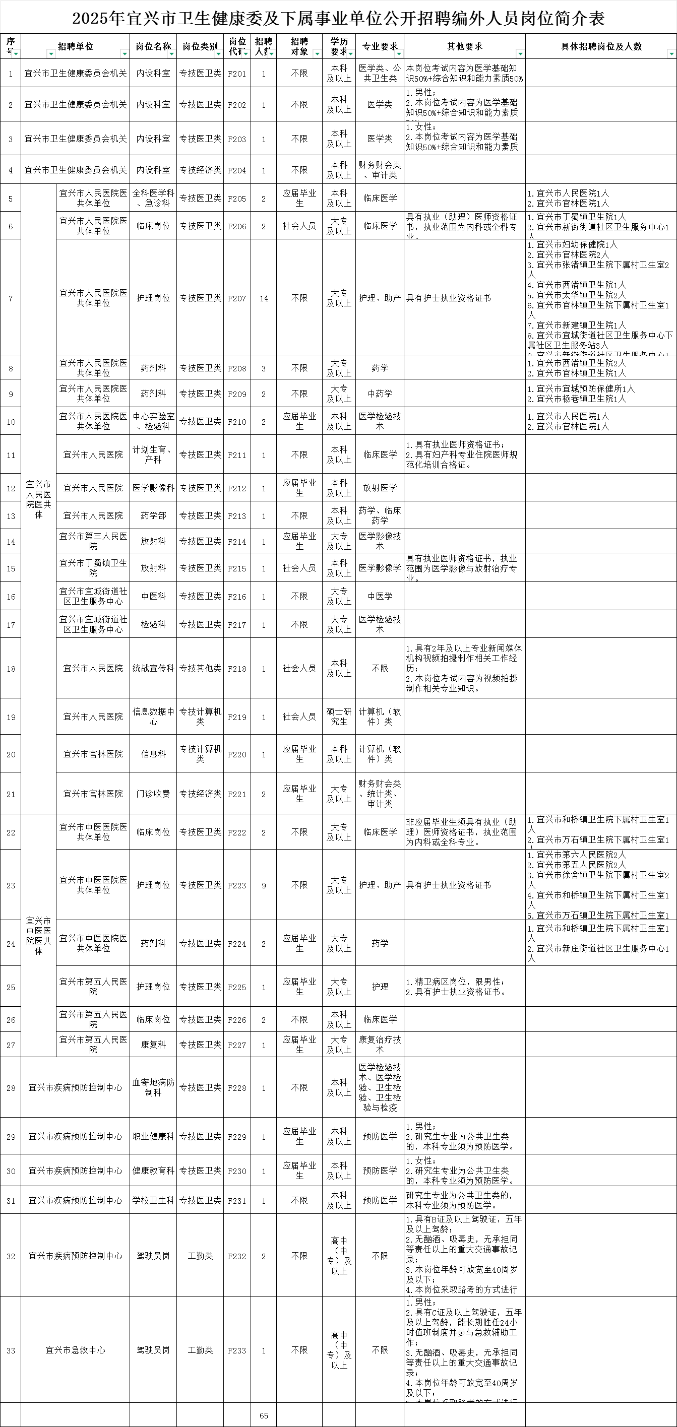 2.取得国家承认的学历证书和学位证书。 3.年龄38周岁以下(1986年1月1日后出生),并具备报考岗位所要求的其他招聘条件(详见附件1《岗位简介表》)。《岗位简介表》中对年龄、其他要求等有特殊说明的,以岗位简介表为准。 4.报考医疗岗位(岗位代码F205-F217,F222-F231)的考生,须满足报考岗位所对应专业的执业资格考试,或全国初、中级卫生专业技术资格考试的报考条件。 5.本次招聘户籍不限。 6.本次招聘对象中的“应届毕业生”:指在2025年毕业并已取得学历(学位)证书的人员。其中,取得博士学历(学位)证书的日期可放宽至2025年12月31日;国(境)外同期毕业人员须在2025年12月31日前完成教育部留学服务中心学历(学位)认证。 符合下列情形之一的,可按“应届毕业生”身份报考: (1)2024年普通高校毕业以及国(境)外同期毕业且已完成教育部留学服务中心学历(学位)证书认证。 (2)从国家统一招生的普通高校毕业,参加基层服务项目(〔 “三支一扶”计划、农村教师特岗计划、“西部计划”、“乡村振兴计划”(含原“苏北计划”)〕)的人员,如参加服务项目前无工作经历,服务期满且考核合格后2年内的(截止报名时)。 (3)以普通高校应届毕业生应征入伍服义务兵的人员,退役后1年内的(截止报名时)。 (4)面向社会招收的普通高校应届毕业生住院医师规范化培训对象,培训合格当年在医疗卫生机构就业的,在招聘中按当年应届毕业生同等对待。对经住培合格的本科学历临床医师,在人员招聘中与临床医学、口腔医学、中医专业学位硕士研究生同等对待(其中住培合格证书中的培训专业应当与招聘岗位的专业或类别要求相一致)。 上述人员若以其非普通高等学历教育的其他国民教育形式(自学考试、成人教育、网络教育、夜大、电大、函授等)学历对应专业报考时,视为社会人员,不能按“应届毕业生”身份报考。 7.招聘岗位专业参考《江苏省2025年度考试录用公务员专业参考目录》。专业条件中还包括部分未列入专业参考目录但确有高等学校开设且有事业单位需要的专业。 8.有下列情形之一的,不得应聘: (1)国民教育序列普通高校在读非2025届毕业生; (2)现役军人; (3)曾因犯罪受过刑事处罚、被开除公职、尚未解除纪律处分或正在接受纪律审查、涉嫌违法犯罪正在接受调查以及被依法列为失信联合惩戒对象等情形人员; (4)《事业单位人事管理回避规定》明确应当回避的岗位; (5)国家和省另行规定不得应聘到事业单位有关岗位的人员; (6)目前已在宜兴市卫生健康委及下属各公立医院、公卫单位、镇卫生院(卫生室)、街道社区卫生服务中心(站)等公立医疗卫生单位就业的人员。 1.现场报名时间:2025年11月15-16日(8:30-11:00,13:30-16:30)。 2.报名地点:宜兴市卫生健康委员会(宜兴市宜城街道陶都路29号)3号楼四楼会议室,咨询电话:0510-87991884。 3.报名要求: 考生须提供以下材料的原件和复印件(请务必提前复印): (1)《2025年宜兴市卫生健康委及下属事业单位公开招聘编外人员报名表》(附件2); (2)在有效期内的第二代身份证; (3)学历(学位)证书; (4)按照国(境)外学历学位报名的,需提供国家教育部留学服务中心认证材料。2025年国(境)外毕业人员,如尚未完成国家教育部留学服务中心认证的,须提供拟申请认证学历(学位)的中文翻译件,并在报名现场填写承诺书; (5)招聘岗位所要求提供的其他材料(如医师资格证书、护士资格证书、住培合格证书等); (6)关于工作经历,以与原单位签订的聘用合同、社保缴纳证明(需加盖市人社部门公章)、住房公积金缴纳证明等为依据,工作年限从2025年11月30日向前推算。岗位要求相关工作经历的,还须提供用人单位盖章的书面证明材料。 4.报名注意事项: (1)考生根据招聘岗位简介表每人只可报考一个岗位。若发现考生本次报考两个岗位的,取消其考试或录用资格。 (2)报名时须使用在有效期内的第二代居民身份证进行报名,并现场提交近期一寸正面半身免冠照片2张。报名由市卫生健康委进行资格审核。考生如有弄虚作假的情况,将取消报考或录用资格。资格审核通过后完成缴费,即报名成功。报名成功的考生,应按照市卫生健康委通知的时间和地点按时参加考试,否则作弃考处理。 (3)本次考试不设开考比例。通过资格审核的考生,现场缴纳报名考试费100元。享受最低生活保障家庭的考生,先现场缴费,若没有违反考试纪律,在参加考试后5个工作日内凭最低生活保障证明和低保证办理减免考务费用手续。 (4)资格审查工作贯穿于招聘工作全过程。在招聘各个环节,如发现填报信息不实、不符合资格条件、弄虚作假的,将及时终止或取消考试(聘用)资格。对扰乱报名秩序或者伪造学历证明及其他有关材料骗取考试资格等严重违纪违规行为的,将按照有关规定处理。 本次招聘除驾驶员以外的其他岗位(岗位代码F201-F231)采取笔试的方式进行考试,笔试时间为2025年11月22日9:00-10:30,笔试地点另行通知。笔试内容为相关专业知识(如岗位简介表中专业要求为两个及以上的,考试内容以第一专业为出题方向)。笔试满分为100分,设50分为合格分数线,达不到合格分数线的直接淘汰。笔试成绩即总成绩。 驾驶员岗位(岗位代码F232-F233)采取路考的方式进行考试,路考主要考察考生车辆(手动档)驾驶技术,满分为100分,设50分为合格分数线,达不到合格分数线的直接淘汰。路考成绩即总