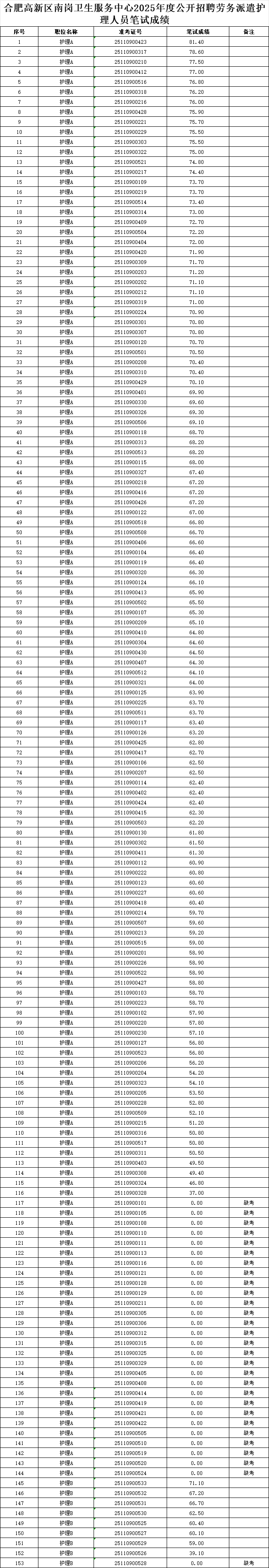 附件:《合肥高新区南岗卫生服务中心2025年度公开招聘劳务派遣护理人员笔试成绩》.xlsx
