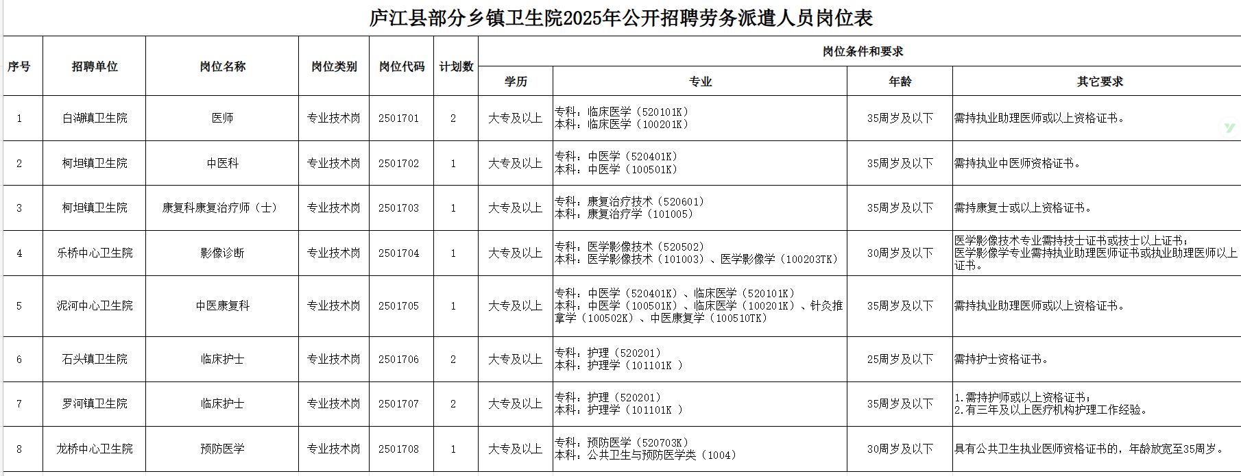 本次共招聘11名劳务派遣人员,具体岗位及条件见附件《庐江县部分乡镇卫生院2025年公开招聘劳务派遣人员岗位表》(附件1)。