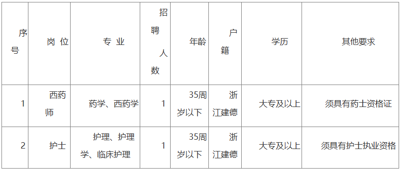 因医院工作需要,经建德市卫生健康局党委同意,现面向社会招聘西药房人员1名,护理人员1名。