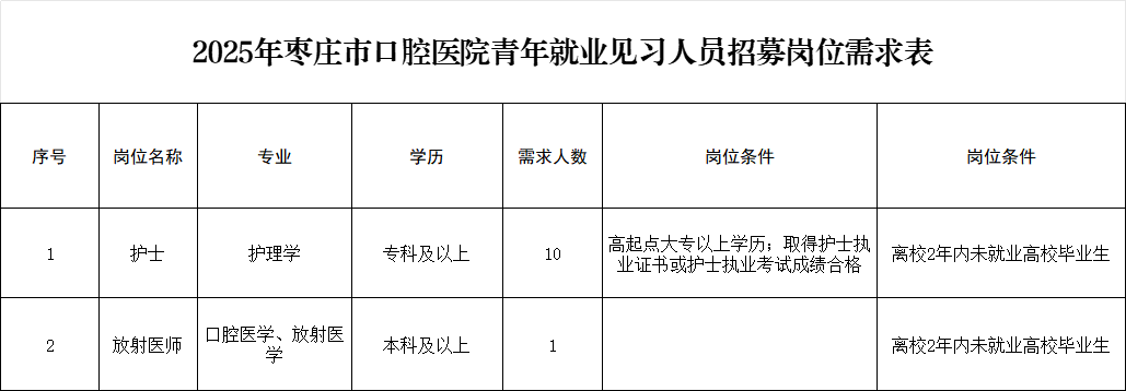 1.2025年枣庄市口腔医院青年就业见习人员招募岗位需求表