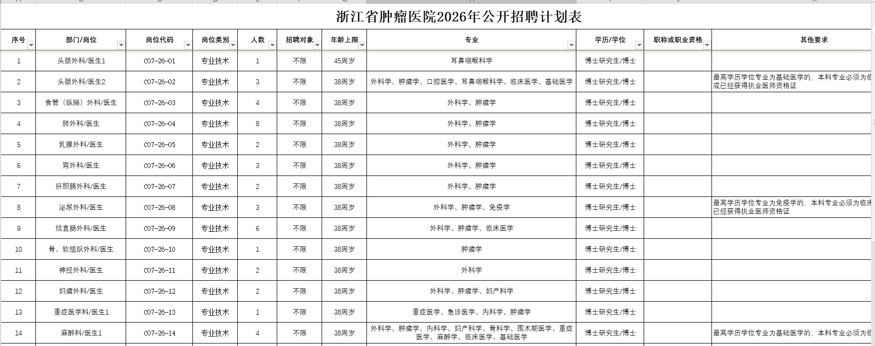 根据中组部、人社部《关于进一步做好事业单位公开招聘工作的通知》(人社部发〔2024〕57号)和省委组织部、省人力社保厅《关于进一步做好浙江省事业单位公开招聘工作的通知》(浙人社发〔2024〕72号)精神,按照《浙江省事业单位公开招聘人员暂行办法》规定,浙江省肿瘤医院面向社会公开招聘工作人员。现将有关事项公告如下: