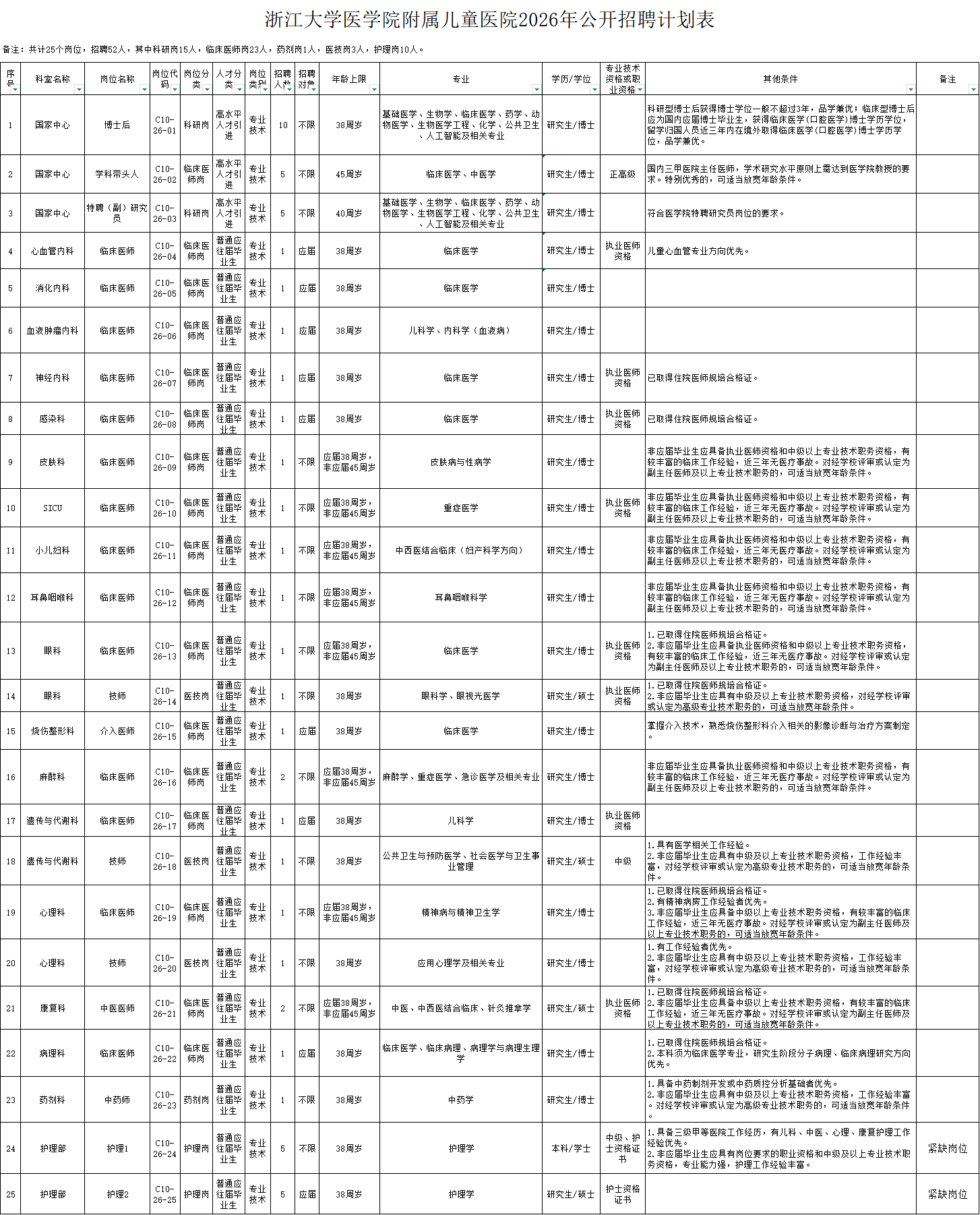 岗位名称、招聘人数及具体要求见《浙江大学医学院附属儿童医院2026年公开招聘计划表》(见附件)。