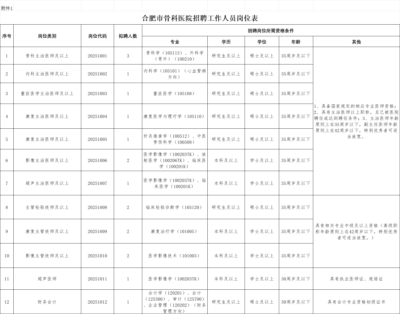 附件1:《合肥市骨科医院招聘工作人员岗位表》