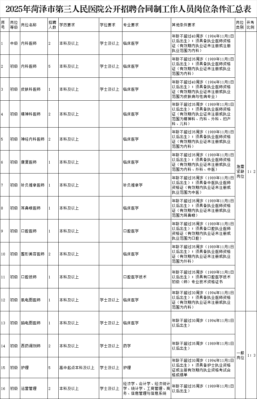 招聘岗位、数量、学历学位以及其他条件要求详见《2025年菏泽市第三人民医院公开招聘合同制工作人员岗位条件汇总表》(附件2)。