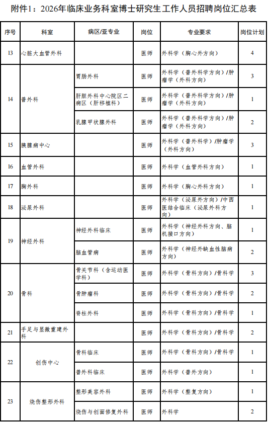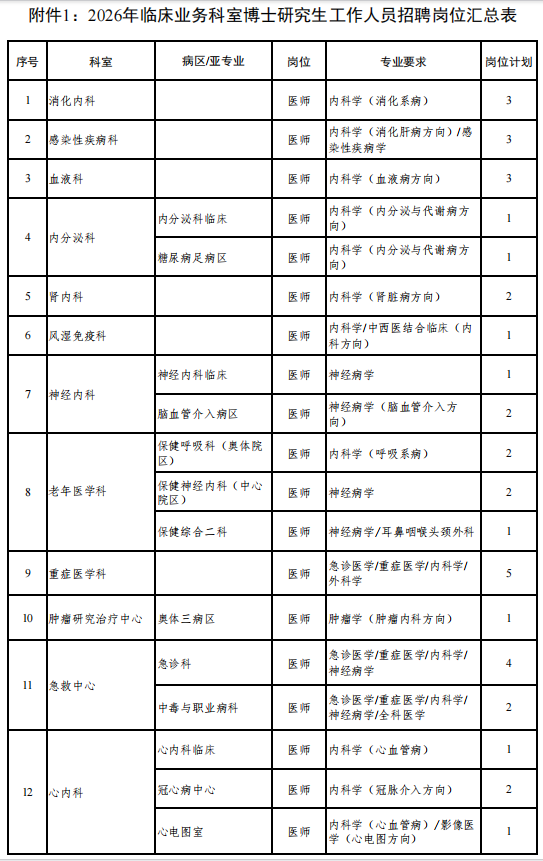 1.年龄要求:博士研究生毕业人员年龄不超过32岁(1994年1月1日及以后出生);博士后出站人员及急救中心岗位年龄不超过35岁(1991年1月1日及以后出生)。应聘人员须具有符合岗位所需的专业要求,详见《2026年临床业务科室博士研究生工作人员公开招聘岗位汇总表》(附件1)。