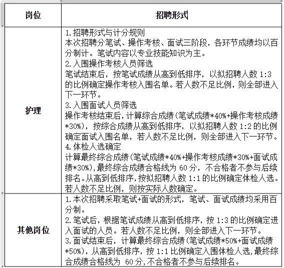 (一)遵守中华人民共和国宪法、法律和法规。遵守纪律、品行端正,具备良好的职业素质。 (二)具有适应岗位要求的身体条件。 (三)具有国家承认的学历学位和专业,且符合招聘岗位所需的学历学位、专业和其他资格要求。 二、招聘岗位及条件 1护士12名 年龄:35周岁以下(1989年12月以后出生)。 岗位要求:护理、护理学、助产、助产学专业,具有护士资格证,年龄为35周岁以下,大专及以上学历,限金华地区户籍。 2导诊4名 年龄:50周岁以下(1974年12月以后出生)。 岗位要求:高中及以上学历。 3B超打字员2名 年龄:40周岁以下(1984年12月以后出生)。 岗位要求:高中及以上学历,熟练掌握电脑打字技能。 4康复技师2名 年龄:35周岁以下(1989年12月以后出生) 岗位要求:康复治疗学专业,具有康复技士(含)以上资格,大专及以上学历。 三、招聘事宜 (一)报名 报名时间:即日起至2025年12月12日下午5时(注:报名时请携带身份证、毕业证、资格证、学信网备案表等相关证件及其复印件),待遇面议。 报名地点:武义县中医院新院区行政楼三楼人事科(白洋街道秦余路12号)。 (二)资格审核 用人单位对报考人员是否符合报考岗位资格条件进行资格初审,未通过资格初审的不得进入笔试环节。 (三)招聘考试考试地点:武义县中医院新院区行政楼三楼(白洋街道秦余路12号)。 考试时间将通过电话或短信形式通知,请保持手机通畅,及时回复信息。未按规定时间、地点参加考试的,视作放弃本次招聘。 (四)体检与考察政审 1.体检人选根据最终综合成绩从高分到低分按岗位招聘计划1:1比例确定,需在一周内完成入职体检,体检合格后组织考察政审。 2.体检不合格的、放弃体检资格的、考察结论为不宜录用的、在办理录用手续前放弃录用资格的,在同一批次岗位招聘面试合格人员中按综合成绩从高分到低分依次递补。 (五)公示和录用 1.体检和考察政审通过后,对拟录用人员进行公示。经公示无异议的,在公示结束后,办理相关手续,签订劳动合同。 2.拟录用人员必须在规定的时间内报到,逾期不能报到的取消录用资格。 3.已录用人员试用期考核不合格或在试用期内离职,3个月内可在同一批次岗位招聘面试合格人员中,按综合成绩从高分到低分依次递补。 (六)其它未尽事宜电话联系或面议 联系人:倪老师 王老师 联系电话:0579-88030064