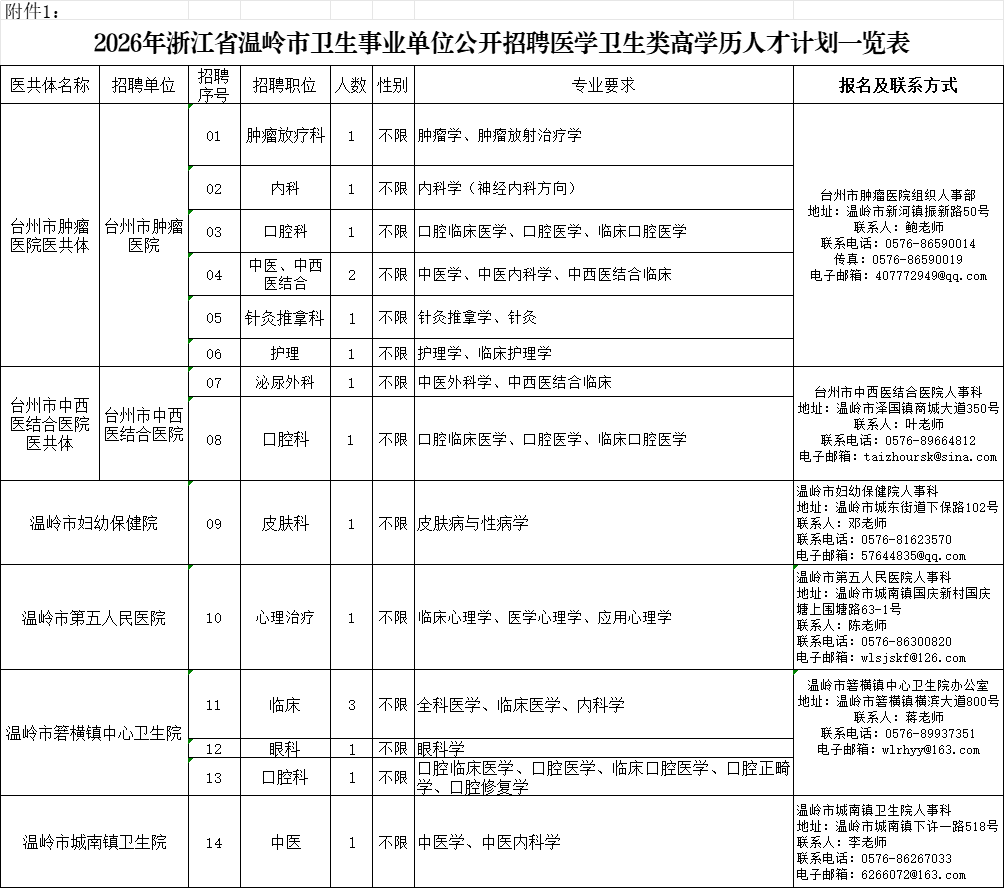 2026年温岭市卫生事业单位计划公开招聘医学卫生类高学历人17名。具体的招聘单位、职位、人数和专业要求等详见《2026年浙江省温岭市卫生事业单位公开招聘医学卫生类高学历人才计划一览表》(附件1)或登录下列网站查询: