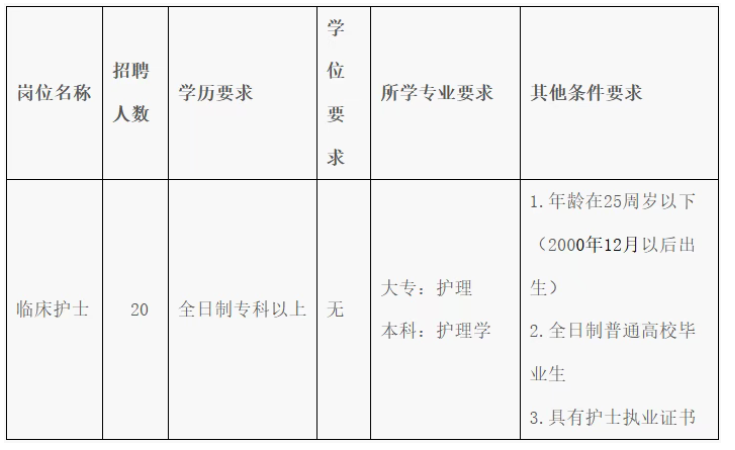4、具备招聘岗位要求的其他所有资格条件。招聘岗位要求的学历证书、护士执业证书等,应聘人员均须于2025年12月9日(含)之前取得;
