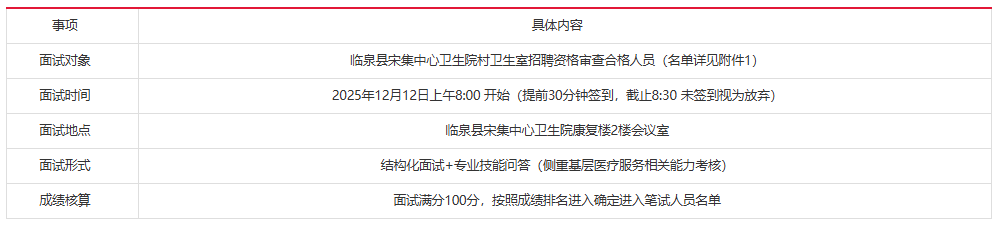 根据《临泉县宋集中心卫生院村卫生室招聘公告》规定,现将本次招聘面试相关事宜正式通知如下,请仔细阅读并按要求做好准备。
