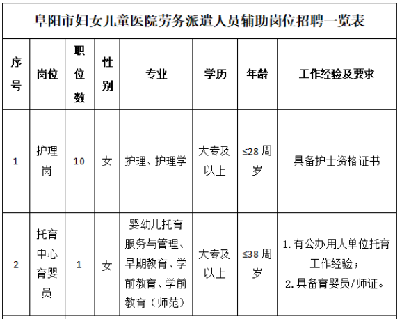 本次招聘采取劳务派遣服务方式,由阜阳市联众劳动事务保障代理有限公司负责全部招聘流程,招聘完成后将派遣至阜阳市妇女儿童医院上岗工作。