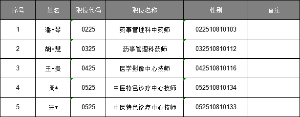 根据《安庆一一六医院公开招聘劳务派遣工作人员公告》要求,现将完成体检考察人员信息公示如下。其余未完成人员,另行公示:
