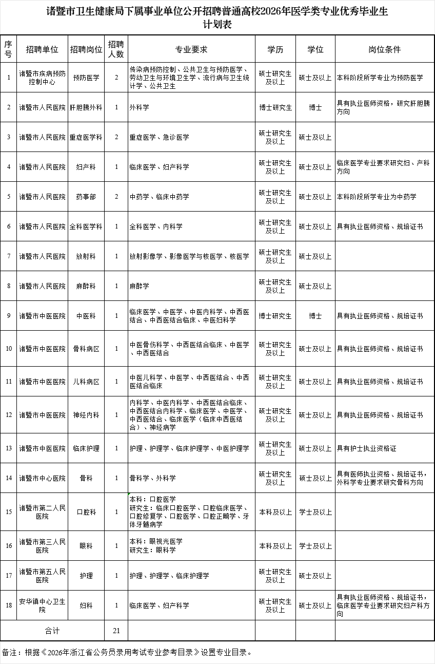 招聘计划、岗位设置详见《浙江省诸暨市卫生健康局下属事业单位公开招聘普通高校2026年医学类专业优秀应届毕业生上海中医药大学专场招聘计划表》(附件1)。