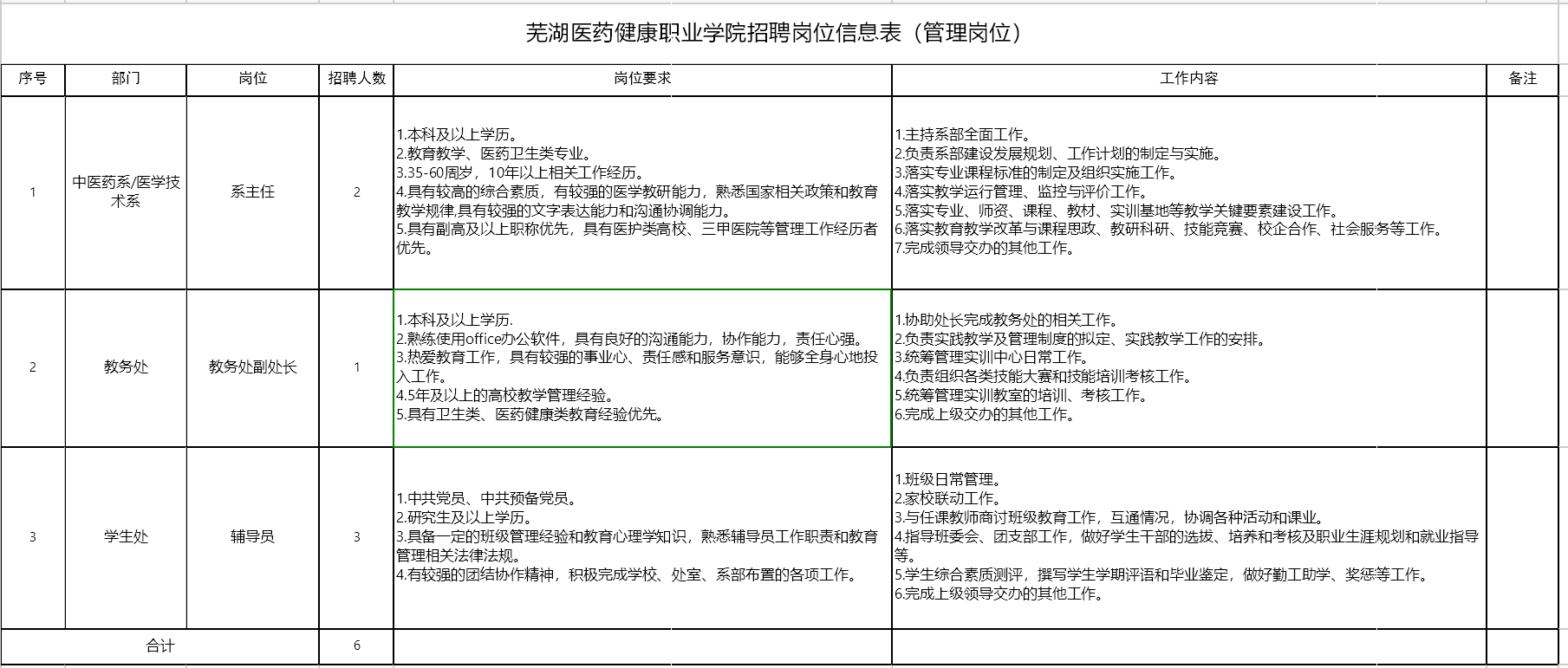 芜湖医药健康职业学院是经安徽省人民政府批准、教育部备案的一所全日制综合类高职院校。学院坐落于芜湖市湾沚区滨湖大道3号,占地400余亩。学院紧密对接省、市十大战略新兴产业中的“生命健康”“文化创意”“绿色食品”三大领域设置专业,以医药卫生、健康服务、康养旅游、幼儿教育与休闲体育等为主,立足芜湖、面向皖东南、辐射长三角。设有护理、中医康复技术、医学美容技术、药品生产技术、中药学、药学、婴幼儿托育服务与管理、健康管理、医疗器械维护与管理、人工智能技术应用等专业。学院坚持立足地方、依托地方、服务地方、发展地方的办学宗旨;坚持教育的公益性原则,强化服务发展宗旨与促进就业导向,推进产教融合、校企合作、工学交替、医教协同,培养德技双馨、扎根基层一线、德智体美劳全面发展的医药卫生和健康服务类高素质技术技能人才,全面服务地方经济社会发展和人民健康美好生活。2.教师岗位:专业带头人3人、思政2人、基础护理3人、专科护理2人、医疗美容技术1人。具体招聘要求详见附件《芜湖医药健康职业学院招聘岗位信息表》。热爱祖国,忠诚党和人民的教育事业。关爱学生,有较高的思想政治素质和职业道德水平。自觉遵守国家法律法规和学院各项规章制度,求真务实、敬业乐业、甘于奉献。1.学历及年龄:本科及以上学历,师范类、医药卫生类专业优先,年龄参照岗位信息表中具体要求,具有副高及以上职称的年龄可放宽至65周岁。2.管理岗位:有一定的文字功底,熟练掌握办公技能,具有较强的业务能力、组织协调能力和管理能力,具有较丰富的社会实践活动经验,教育教学、实践经验丰富,有高校工作经历者优先录用。所有报名程序线上完成,一人限报一岗,报名截止时间即日起至岗位招满为止。3.学历、学位、教师资格证、执业资格证书、专业技术职务资格证、各类荣誉和获奖证书等证件。应聘人员对提交材料的真实性负责。凡个人填报信息不实,不符合招聘岗位要求的,一经核实,即取消考核或聘用资格。以上三类材料均提供清晰彩色扫描件,按照顺序分类生成PDF文件。三类材料打包压缩,统一命名为“姓名+拟报名岗位名称”(一人限报一岗)发送至指定邮箱。(whyyjkzyxyzzrsc@qq.com)院组织人事处会同相关处室及用人单位,根据学院相关文件精神、岗位要求和应聘者自身条件进行资格审查,并通知资格审查合格者参加考核(审查未通过者,学院不再逐一通知)。考核主要考察应聘人员基本素质,内容包括自我介绍、技能测试和相关问题答辩等。学院根据考核成绩高低排序确定拟录用人员。拟聘及递补人员须按时到学院指定的医院进行体检,体检工作按《关于进一步规范全省事业单位公开招聘人员体检工作的通知》(皖人社秘〔2013〕208号)等有关规定执行,有关费用自理。根据拟聘岗位的要求,全面了解掌握拟聘对象在政治思想、道德品质、遵纪守法、廉洁自律等方面的情况,政审不合格者不予聘用。体检合格的拟聘人员,学院将与其签订劳动合同,签约后相关执业资质和党员关系统一转至学院。辅导员综合年薪8-18万;教师综合年薪10-18万;管理干部综合年薪10-20万;专业带头人综合年薪18-30万。福利:五险一金、节日慰问、生日福利、公寓式住房、精致员工餐、带薪休假、公费旅游、工作服、电脑补贴、提供全面的专业培训及完善的晋升平台。(1)按照《湾沚区关于促进人才安居乐业推进航空新城建设的意见》(湾政办〔2024〕1号)符合条件的高层次人才可享受购房补助:①具备博士学历毕业生或具有正高级专业技术资格的人才,给予总房款 12%、契税 100%的奖励。②具备硕士学历毕业生或具有副高级专业技术资格、高级技师技能等级的人才,给予总房款 10%、契税 100%的奖励。③具备本科学历毕业生或具有中级专业技术资格、技师级技能等级的人才,给予总房款 7%、契税 100%的奖励。(2)按照《芜湖市湾沚区“产学研创”人才政策十八条的通知》(湾人社〔2023〕29号)符合条件的享受以下政策:①就业补贴。毕业两年内的高校毕业生,首次在区内企业(含民办非企业)稳定就业6个月以上,按照本科、硕士及以上学历,分别给予每年8000元、10000元的就业补贴,补贴期限不超过2年。②周转金支持。为本科以上学历的高校毕业生提供乐业周转金,在区内购买商品住宅房,最高给予20万元支持,最长周转期限10年,5年免息,5年低息。③安居生活补贴。在区内企业(含民办非企业)稳定就业满6个月的高校毕业生,首次在区内购房并落户,给予1000元/月的生活补贴,补贴期限不超过2年。(3)院校聘用人才为高级管理人才在子女就学方面开辟“绿色通道”予以倾斜。咨询时间:9:00-11:00 14:30-17:00(工作日)