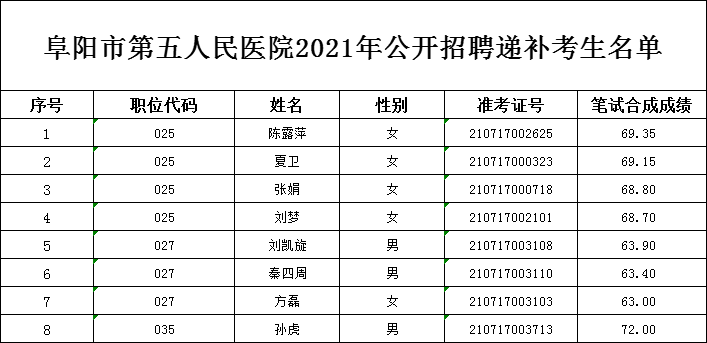 根据《阜阳市第五人民医院2021年公开招聘工作人员公告》,并于2021年8月27日院领导班子会议研究通过,拟对资格审查和体检政审环节中出现缺额的部分岗位,在同岗位报考人员中,按笔试成绩从高分到低分递补,现将名单予以公示。