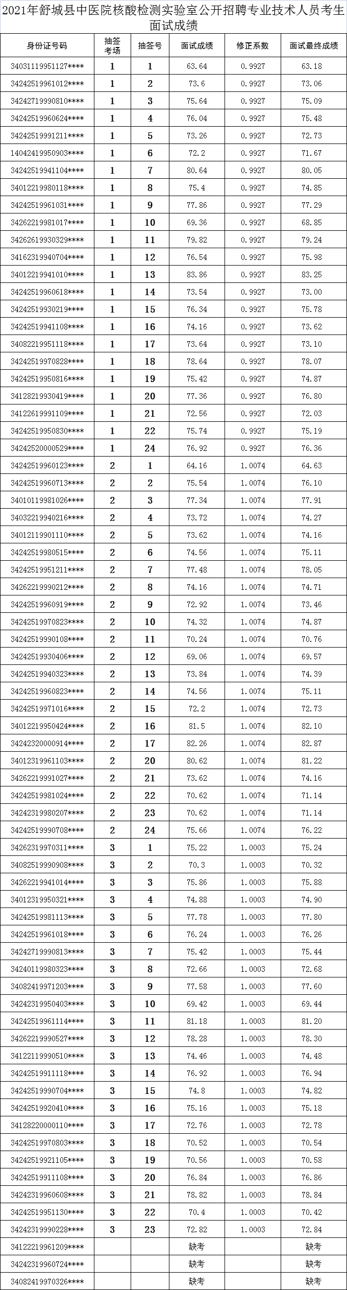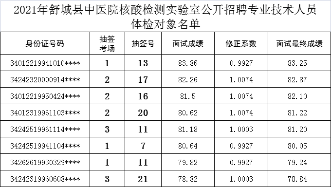 根据《2021年舒城县中医院核酸检测实验室公开招聘专业技术人员公告》有关规定,现将2021年舒城县中医院核酸检测实验室公开招聘专业技术人员面试成绩予以公布(附件1),并就体检有关事项通知如下。